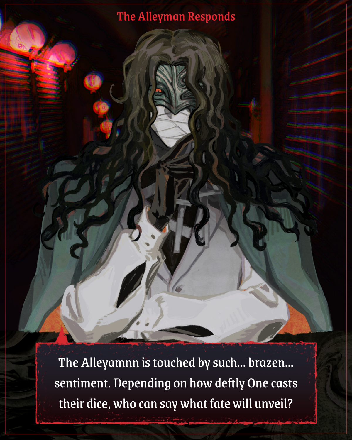 In a final bid to cheat death, you challenge The Alleyman to a high-stakes dice game where every roll could be your last.